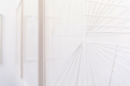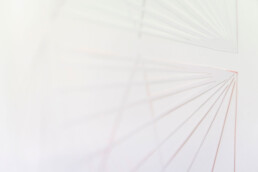 I’m afraid it’s red, yellow and blue ist […] eine Werkgruppe feingliedriger Papierschnitte im Rahmenformat 105 x 75 cm. Ein Teil der weißen Schnitte auf weißem Grunde ist dabei von einem ausnehmend zarten Schimmer, jeweils in rot, gelb oder blau unterlegt. Dementsprechend nimmt die Künstlerin mit ihrem Ausstellungstitel und einem Augenzwinkern Bezug auf den legendären Barnett Newman Titel Who’s afraid of Red, Yellow and Blue, der seinerseits inmitten eines Beziehungsgeflechts aus popkulturellen Verweisen steht, was wiederum als Analogie zu Dorthe Goedens gezeigter Werkgruppe gelesen werden kann, die als Netzwerk von verdrehten, manipulierte und bespiegelten Zitaten ausgeführt ist.